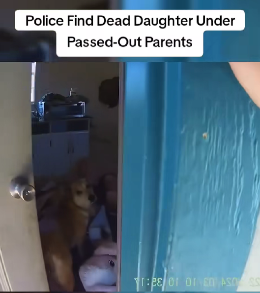 Bodycam footage, now part of the investigation, shows officers pushing open the front door, calling out to anyone inside. A dog immediately appeared, pacing nervously and whining. Moments later, officers spotted the parents collapsed on the floor, motionless. After checking their pulses and realizing they were breathing but unresponsive, they noticed something far more tragic — a small child trapped beneath them.